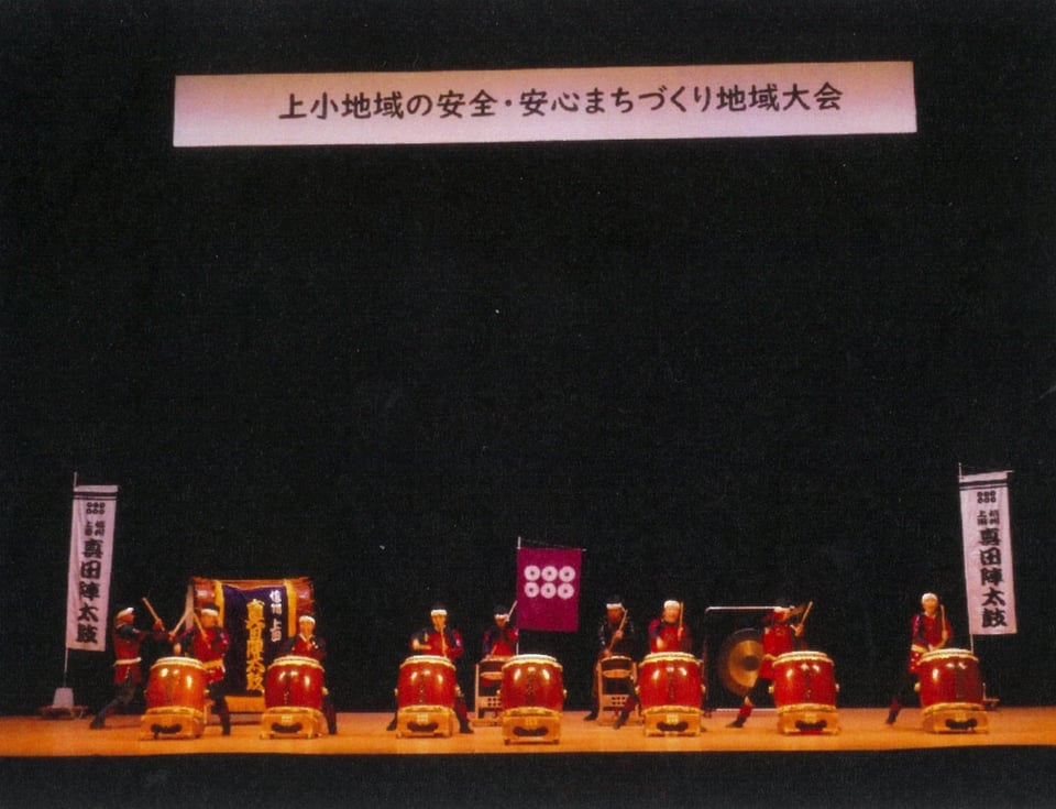 9月12日(金)上小・依田窪防犯協会連合会、上田市防犯協会は、上田市内サントミューゼ(大ホール)において「第8回上小地域の安全・安心まちづくり地域大会」を開催しました。約300人が集まり、「信州上田真田陣太鼓保存会」による、迫力ある演奏を皮切りに、開会宣言、主催者代表挨拶、上田警察署挨拶等を行ったあと、研修では