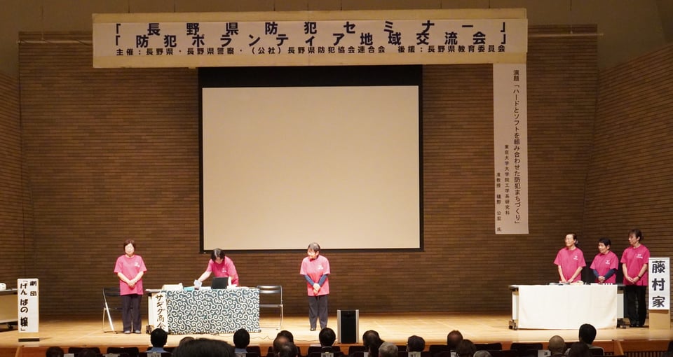濵村由美子防犯女性部長の開会のことばに続き、主催者長野県警察本部木榑秀満生活安全部長の挨拶、地元塩尻警察署小島伸之署長の挨拶の後、今年度の全国防犯功労表彰、関東防犯功労表彰を受賞した皆さんへの表彰伝達式が行われました。さらに、警察本部総合犯罪防止対策室丸山勝広室長から、電話でお金詐欺の発生状況と対策についての説明があり、地元塩尻・朝日防犯協会連合会女性部「劇団げんばの嬢」による「電話でお金詐欺(特殊詐欺)」の被害防止啓発寸劇が行われました。