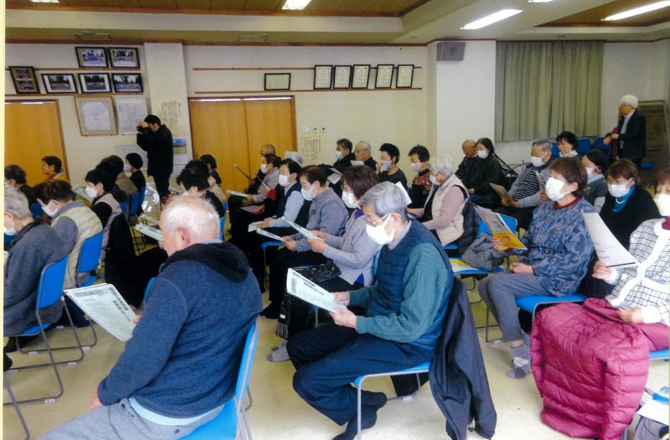 12月5日(金)駒ヶ根市内の老人福祉センターで開催された「高齢者クラブ」において、伊南防連合会と駒ヶ根警察署は協同して「電話でお金詐欺(特殊詐欺)」被害防止のための防犯講話を行った後、駒ヶ根警察署員4名の音楽ユニット「コマガネ・サギストッパーズ」による歌「私はだまされない!」を演奏した。