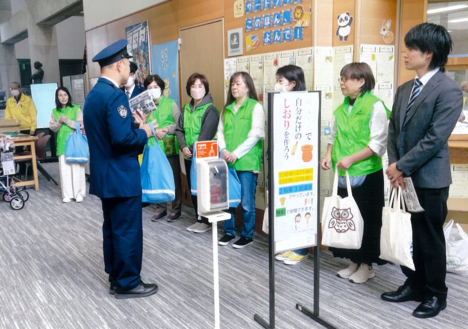 伊南防犯連合会、駒ヶ根警察署は、4月15日年金支給日に管内の「道の駅花の里いいじま」と「ツルヤ赤穂店」の2箇所において、増え続ける電話でお金詐欺の被害防止を呼びかけました。
