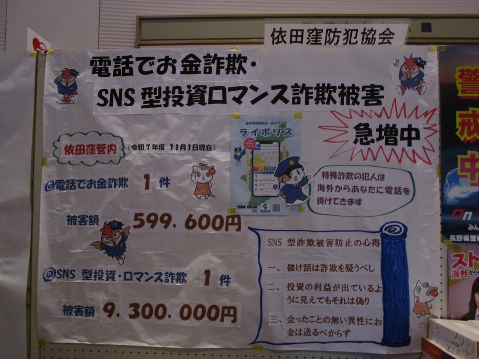 10月15日(水)伊南防犯連合会(中川地区防犯女性部他)と駒ヶ根警察署は、中川村の商業施設において連携して「年金支給日」における「電話でお金詐欺(特殊詐欺)」被害防止の呼びかけを実施しました。また、啓発物品を中川村観光案内所や各金融機関等に配布して、来訪者や来客に対する特殊詐欺被害防止についての協力をお願いしました。