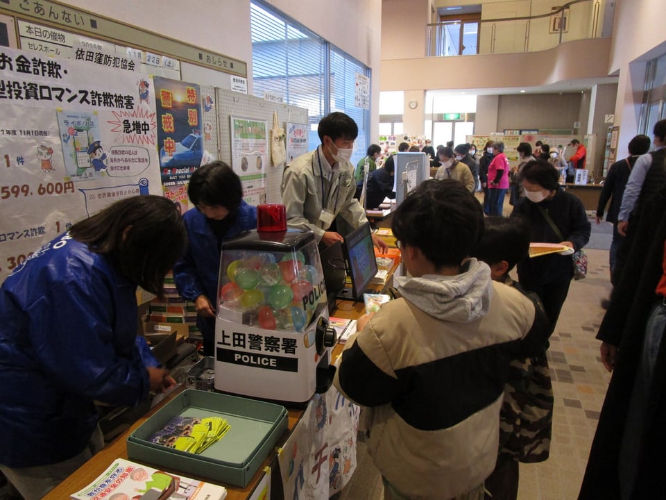 11月22日(土)丸子文化会館で開催された「第39回丸子地域消費生活展」(主催:丸子地域消費生活展実行委員会)において、依田窪防犯協会連合会は上田警察署と連携して「パネル展示」と「防犯ガチャ」等を活用して、電話でお金詐欺(特殊詐欺)被害防止のための啓発活動を実施しました。会場となった丸子文化会館では29団体が出展し、約300名が参加しました。会場を訪れた沢山の家族連れには、特に「ガチャ」が大好評で、子供だけでなく大人にも大好評でした。